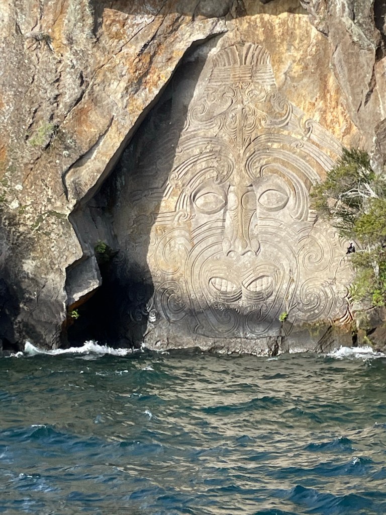 Ihr seht Richtig. Eine Mäcces Bahnstation. Das hatte so das Feeling von der Eislaufbahn im Einkaufscenter in Bangkok. So Out of Place. Tatsächlich war auch am Hafen, ein kompletter FastFood-Block. Mäcces, Burger King, Pizza Hut, Subway, KFC und noch 2-3 neuseeländische Ketten. Nur meinen Starbucks hatten sie nicht. Voll unverschämt. Bin auf jeden Fall erstmal ein bisschen spazieren gegangen, weil ich erst gegen Mittag auf ne Bootstour gehen wollte. Da sind wir dann auf den Lake Taupo zu Stone Carvings gefahren. Dachte ja es wären mehrere, aber tatsächlich war es nur Eine.