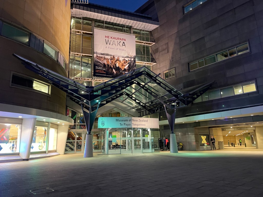 Mit Kapelle und allem drum und dran haben Chinesen demonstriert. Ich kam mir dann auch irgendwie verfolgt vor. Überall wo ich hin bin sind die auch hin. Das Leidige daran war auch, dass ich mein Tablet dabei hatte und bei jedem Paukenschlag das Ding vibriert hat. Keine Ahnung warum, aber hat sich am Rücken schon dumm angefühlt. Ich bin dann bei Starbucks eingekehrt und hab mir erstmal meine heiße Schokolade organisiert. Dieses Mal eine „Richtige“, nicht wie die Tage eine Weiße. Als die Demo dann am Starbucks vorbei war bin ich einfach in die andere Richtung weiter gelaufen. Das tat dann auch meinem Rücken gut. Mein Plan war eigentlich mich mit dem Tablet ein bisschen an den Hafen zu setzen und zu schreiben, aber heute hat’s gewindet. Abnormal! Hätte nicht viel gefehlt, dann wäre ich auch weggeweht worden. Sowas hatte ich auch noch nicht. Dachte der Wind die ersten zwei Tage wäre schon ordentlich, aber das waren nochmal ganz neue Dimensionen. Wellington ist ja bekannt dafür, das es windet, aber so arg? Also nichts mit hinsetzen und spazieren gehen, wenns einen fast wegweht. War schon schade, aber was willste machen? Also dann halt ab ins Museum. Bin gleich zum Infodesk um abzuklären, welche Ausstellung etwas kostet. Ich glaube der gute Mann dachte, ich will nur in die Kostenlosen, dabei wollte ich eigentlich ein Ticket kaufen. Es hat sich dann herausgestellt, dass alles for Free war. Ich wollte mir ja die zum ersten Weltkrieg anschauen. Er hat gleich gesagt, dass diese sehr deprimierend sei. Man müsste sich aber einfach ein bisschen das Positive raussuchen, damit es nicht so belastend ist. So war zum Beispiel im ersten Raum eine Skulptur von einem Lieutnant, der am Boden lag, ein Arm angeschossen. Der Angestellte meinte dann, dass er Künstler war und Rechtshänder. Der angeschossene Arm war natürlich der Rechte und musste wohl amputiert werden. Was da aber nicht bei den Infos steht: Er hat später wieder gemalt. Nur halt mit Links. Besser als zuvor mit der anderen Hand. Sowas solle ich halt bedenken. Das es auch positive Geschichten gäbe. Im Prinzip hat er mir wie ein Guide dann sowas erklärt. Also irgendwie war er am Infoschalter fehl am Platz. Fande ich zumindest. Er hat mir auch gleich gesagt, in welche Ausstellung ich danach sollte, damit meine Laune wieder besser wird nach dem schweren Thema. Soweit kam ich aber tatsächlich nicht mal. Also zu der anderen Ausstellung. Ich bin schon in die Erste rein und mir ging’s nicht besonders gut. Das halbe Brioche in meiner Hand hat auch nicht geholfen. Trinken durfte man ja sowieso darin nichts. Konnte als auch meinen Blutdruck nicht mit Zucker pushen. Ich musste sogar meine verschraubte Flasche in den Rucksack stecken. Außen war nicht OK. Die Luft stand halt auch extrem und alles war Dunkel und mit Plakaten zugekleistert. Alles mit blutroter Schrift natürlich. Und so ging’s mir immer Schlechter und mein Umfeld wurde mit jedem Raum negativer. Da saßen sogar weinende Leute in der Ausstellung. Ich bin dann nach der Hälfte raus, weil ich wollte nicht irgendwo im Dunkeln auf dem Boden liegen. Mir war schon Turbo Schwindelig und Safety First würde ich mal sagen. Bin erstmal ins Museumscafé und hab mir eine Cola und Essen gegönnt. Dachte das es evtl. am mangelnden Essen liegt und ich so meinen Kreislauf wieder in den Griff bekomme. Wurde dann auch etwas besser, aber ich habe mich dann gegen 14 Uhr entschlossen nicht nochmal in die Ausstellung zu gehen, sondern lieber ins Hostel. Meine Kopfschmerzen hatten da schon neue Dimensionen angenommen. Wer dann heute Mittag im Bett lag war ich. Wollte eigentlich 2 Stunden später wieder los, aber da war nichts zu holen. Bin dann kurz vor 5 erst wieder raus. Kennt ihr den Moment, wo man Hunger hat, aber genau weiß, das einem schlecht wird, wenn man was isst? Genau an dem Punkt war ich. Ich bin dann erstmal zum New World und hab mir Mandarinen und Fruchtsaft gekauft, weil Vitamine hat mein Körper schon lange nicht mehr gesehen. Und Mandarinen kann man mal schnell snacken unterwegs. Ich bin dann noch am Museum vorbei, damit ihr mal seht, wie das von Vorne aussieht.
