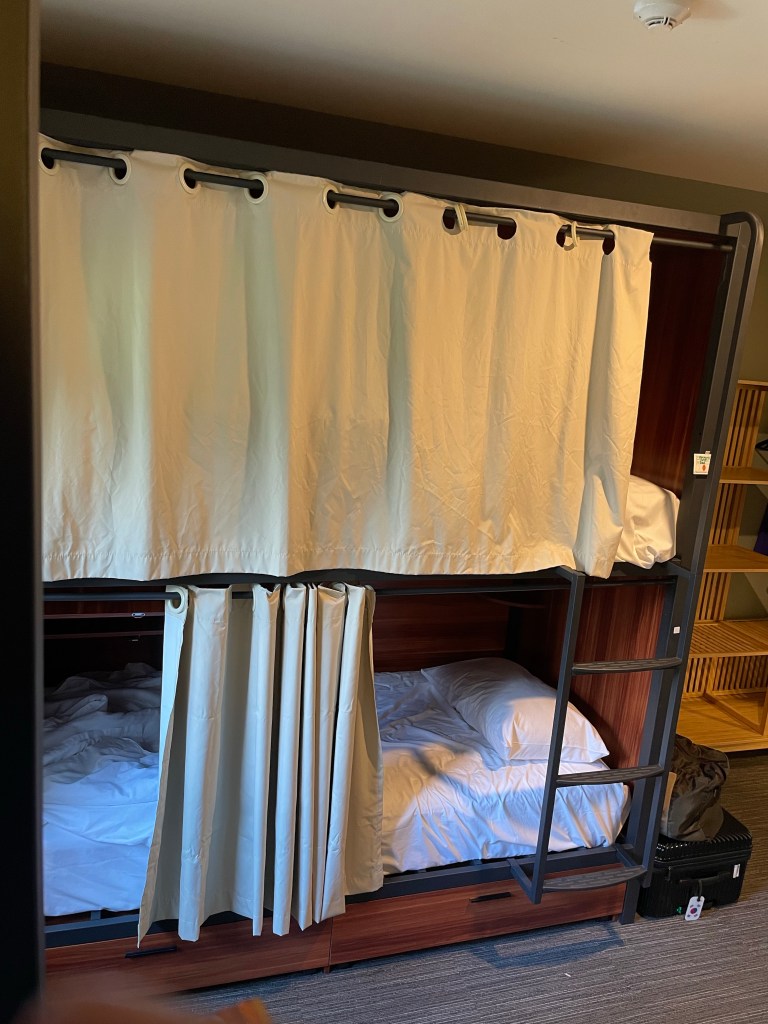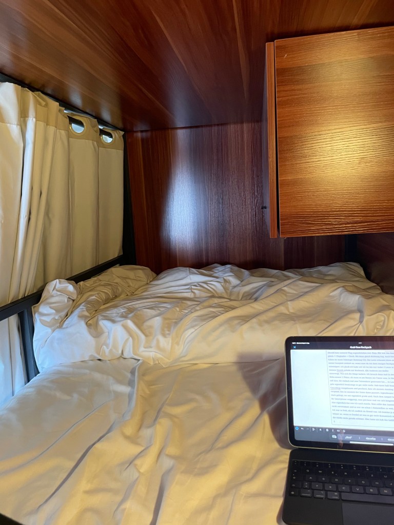 Bin dann gleich Richtung Zug. Auch hier haben sie einen Zubringer Richtung City. Die Leute schauen einen auch immer komplett irritiert an, wenn man da mit dem riesigen Backpack reinstolpert. Ich glaub ich habe seit ich los bin nur 4 oder 5 Leute in meinen Hostels gehabt mit Rucksack. Alle Anderen sind mittlerweile mit Koffer unterwegs. Wie sich die Dinge ändern. Ich brauch dann halt in der Bahn immer 2 Plätze, also muss es am Besten ein Vierer sein. In Meinem saß Eine, die einfach mal eine Talentshow gestreamt hat…. In Laut. Das geht eigentlich heutzutage so gar nicht mehr. Hab dann halt Noise Cancelling reingehauen und geschaut, dass ich meinen Ausstieg nicht verpasse. Das ist nämlich der Dame dann passiert. Irgendwann hat sie mich gefragt, wo wir eigentlich grade sind. Nach dem Airport hatte sie ihr Smartphone weggelegt, raus geschaut und vor sich hingeträumt. Also eigentlich das was ich auch immer mache. Man sollte den Ausstieg halt nicht verträumen und so war sie schon 2 Haltestellen zu weit…. Ups. Ich war so froh, als ich endlich im Hostel war. Ich komme ja auch immer an, wenn es Dunkel ist was so gar nicht Romantisch ist. Macht die Städte nicht gerade schöner. Hier hatte ich halt das Gefühl, dass in Brisbane so gar nichts los ist. Angeblich wohne ich im CBD, aber wo waren bitte die Restaurants und Läden? Was mich halt extrem gestresst hat… und da war ich auch selbst mit dran Schuld: Ich wollte waschen und habe das dann in meiner alten Unterkunft rausgeschoben um alles hier zu machen. Dumm war nur, dass die hier keine Maschinen haben. Hätte ich mal besser auf Booking.com nachgelesen. Und natürlich war die nächste Wäscherei auch nicht grade ums Eck, sondern irgendwo JWD. 15 Min Fußmarsch den Berg hoch. Gott, war ich motiviert. Ich sag’s euch. Innerlich hab ich gekotzt. Sorry wegen dem Ausdruck, aber es ist echt so. Man hat so seinen Plan im Kopf und Bämm: Lauf mal Nachts mit all deiner Wäsche durch ne fremde Stadt und such ne Wäscherei. Und in der muss man sich ja auch erstmal durchlesen, damit die Maschinen richtig funktionieren. BOAH! Ging mir das gegen den Strich. Meine Laune war dezent im Arsch. Wenn man im Dunkeln ankommt, die Stadt eh schon nicht schön ist und dann noch diese Aktion. Habe dann halt meine Mum mit Sprachnachrichten zugebabbelt, bis mein Zeug fertig war. Wenigstens gehen die Waschgänge hier nicht ewig und ich habe nur knapp 2 Stunden verloren inklusive Fußweg. Was ich auf dem Heimweg total Crazy fand, war das da plötzlich an den Straßen Wägen mit kostenlosem Essen standen. Ein Kleinbus mit mobilen Duschen und Waschmöglichkeiten war auch da. Waren dann natürlich viele Obdachlose unterwegs. Fand’s ganz cool, dass sich da Organisationen Aktiv drum kümmern. Keine Ahnung, wie das in Karlsruhe so ist, aber in der Form habe ich das zum ersten Mal gesehen. War zumindest mal ein erster, positiver Eindruck von Brisbane. Ah, noch zu meinem Hostel. Also Zimmer sind ganz OK. Da es Pods sind sowieso. Wir haben auch ein Bad für unser 4er Zimmer, was echt Luxus ist. Aktuell sind wir zu dritt, da heute Nacht ja eine Ausgezogen ist. Hier gibts auch keine Schlüsselkarten, sondern Schlüsselarmbänder. Ziemlich Praktisch. Läuft man schon nicht Gefahr die Karte zu vergessen. Habe mich eh schon gewundert, dass mir das in den 4 Wochen noch kein einziges Mal passiert ist. Hier übrigens noch Bilder von meiner aktuellen Bleibe.